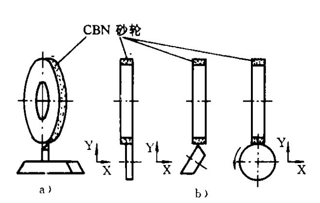 陶瓷結合劑CBN砂輪的修整有兩種方法,一種是切入成形法,另一種是仿形生成法。切入成形法的工作原理是通過一個形狀與所要求的砂輪形狀完全相反的反印電鍍的金剛石修整輪切入砂輪中產生所要求的砂輪形狀。仿形生成的工作原理是通過計算機數字控制引導粉被修整的砂輪越過單點金剛石(圖a)或金剛石滾輪(圖b)而產生出所要求的砂輪形狀。