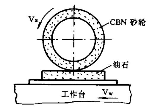 磨削油石法是一種很簡單的CBN砂輪修整方法,如圖2所示。試驗表明,采用不同粒度的碳化硅油石均可對CBN砂輪進行修整,磨粒的突出量約為0.01-0.o2mm。粒度改變時,對修整效果影 響不大。另外,用這種方法修整CBN砂輪時,加大切深并不會取得好的修整效果,相反,會導致磨削力增大,引起磨粒破碎,使CBN砂輪表面母線不平直。磨削油石法的缺點是不能使CBN砂輪形成足夠的容屑空間,從而不能滿足大切削用量的要求。