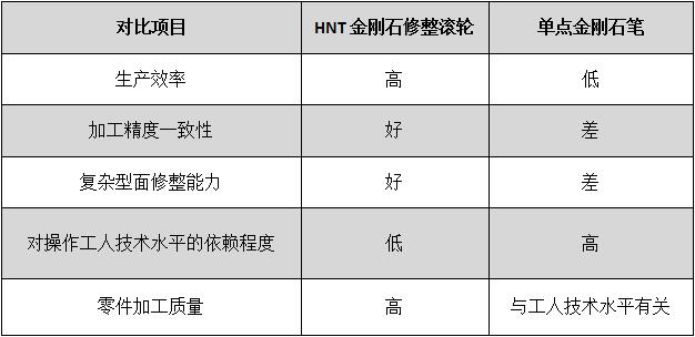 具體金剛石滾輪修整器相比金剛石筆的優(yōu)勢如下表: