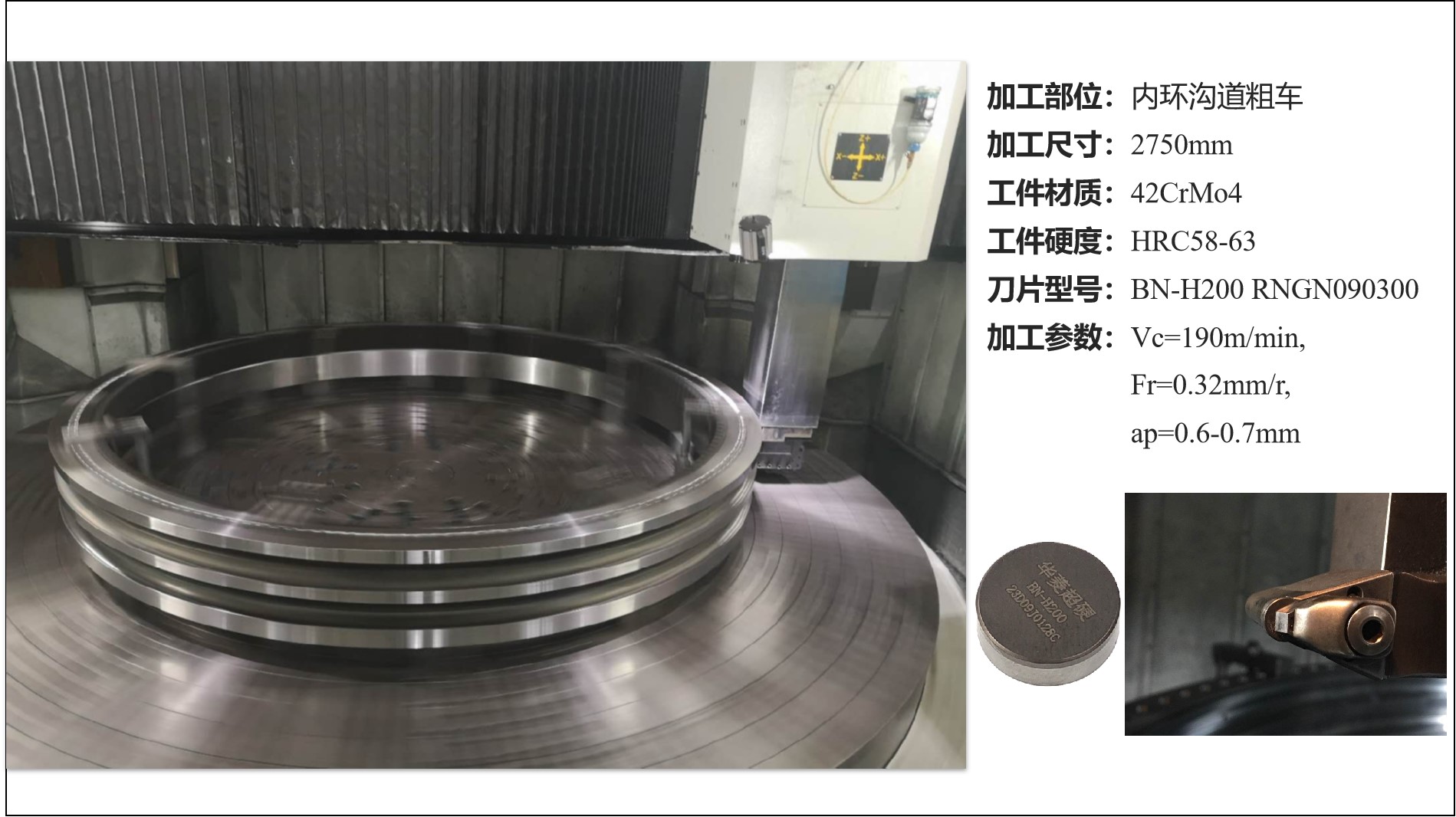 (2)風電軸承內環加工案例:加工的部位是內環溝道粗車,加工直徑達到2750mm。該軸承的材質主要是42CrMo4,硬度高達HRC58-63??蛻粼炔捎玫腃BN刀片不耐磨,導致加工至下溝道部位時壓力角尺寸超差,粗糙度超差,并且工件表面有劃痕。華菱為客戶推薦使用了BN-H200 RNGN090300的PCBN刀片,并對加工參數進行了調整。BN-H200材質CBN刀片良好的耐磨性面對客戶的痛點不治而愈,迎刃而解。