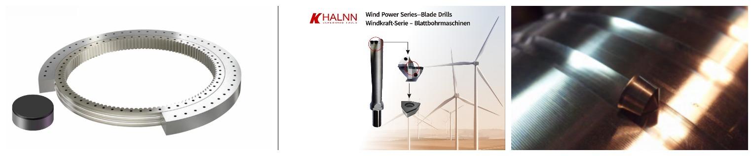 華菱新一代全貼面PCD刀具:針對風電軸承球溝道硬車,華菱提供RNGN全貼面PCD/PCBN刀片,高耐磨性實現高質量精加工。針對風電葉片法蘭孔的鉆削,華菱超硬提供PCD全貼面U鉆刀片,具有優異的耐磨性,主要以W形和S形為主,可轉位3-4次,降低生產成本,同時可承受更高的切削速度和進給速度,配合剛性優異的刀桿,在保持尺寸精度的同時實現穩定高效的鉆削。針對碳化鎢輥環(硬度> HRA 88),華菱提供全貼面PCD刀片RCGX型號。