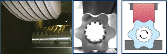 切入式金剛石滾輪修整工藝:是成形滾輪修整成形砂輪,金剛石滾輪和所需要修整的砂輪型面正好相反,通過電機驅動金剛石滾輪旋轉,對砂輪做短行程的徑向切入運動,從而實現砂輪的修整;切入式金剛石滾輪可制作各種復雜成形面。