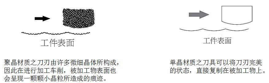 從上述對比可明顯看出,PCD金剛石刀具的刀刃邊緣會呈現鋸齒狀,而單晶金剛石刀具則平順光滑,其加工工件的表面質量,也基本就是刀具刃口的“復制”。